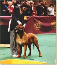 JH: I saw my first Rottweiler in 1979, in the back of a pick-up truck at Dania Beach, Florida. He was the most beautiful and noble looking dog I have ever seen in my whole life, and a very stable temperament to boot. How else could he stay in the back of that pick-up truck!!!!!!!!! My fianc�e (my husband now) had a friend whose mother was a breeder in Alabama. She sent us a six-month-old puppy that had never been out of the kennel. From the moment out of the vari kennel he taught me about stable temperament. I believe that is why I am such a stickler about temperament. I started with the best! I have owned Rottweilers since 1982. I began actively showing around 1988 when I started showing my first show dog, Calvin von Valiant Bismark, and I bred my first litter in 1989 under the kennel name Hobson's Choice.