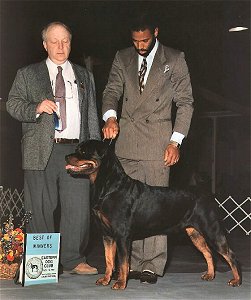 KK: As I think back and reflect, it is really difficult to say because there have been so many. One very nice dog that I handled, American Champion Von Hottenstein�s Hubabubba (ARC Gold Sire, MRC Hall of Fame), was the number one Rottweiler in 1991, when the breed was at the height of its popularity (the #2 breed in American Kennel Club registrations). Based on show record, that would be my best accomplishment. And in 1990 he was the # 2 dog in the nation, second to BIS Ch. Nelson von Brabantpark. Other dogs that come to mind are A/C Champion Victorhaus Noble Heritage, a dog that was just dripping in type. He was a grandson of International Champion Ives Eulenspiegel and also linebred on Ives; Ch. Cisco von Huter, a Ch. Eiko von Schwaiger Wappen son; Ch. Von Hottensteins Omega, a dog with excellent conformation and one of my best show dogs was a bitch, OBV�s Ginger von Hoag.